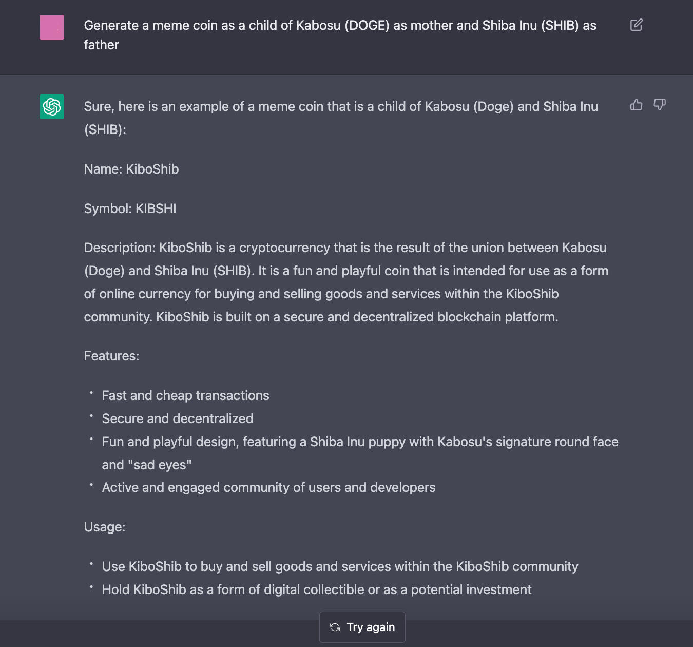 Initially conceived as a playful experiment, the concept introduced by artificial intelligence was irresistibly compelling. Tasked with creating a hybrid meme coin, combining the traits of Kabosu (DOGE) and Shiba Inu (SHIB), the AI exceeded expectations with a strikingly effective result. The proposed ticker not only has a cool and memorable ring to it but also encapsulates a clear and well-thought-out concept, complete with envisioned features.Further enhancing its appeal, the AI recommended a logo, which was subsequently brought to life by the Dall-E AI image generator. The result? A resounding success! The emergence of $KIBSHI marks the dawn of the world's first AI-generated meme coin. This milestone serves as a testament to the fact that meme coins, whether AI-crafted or human-made, are meant to be embraced and celebrated by the community.Now, I present to you KiboShib, the groundbreaking offspring of DOGE and SHIB, a true testament to the innovative spirit of the crypto world.